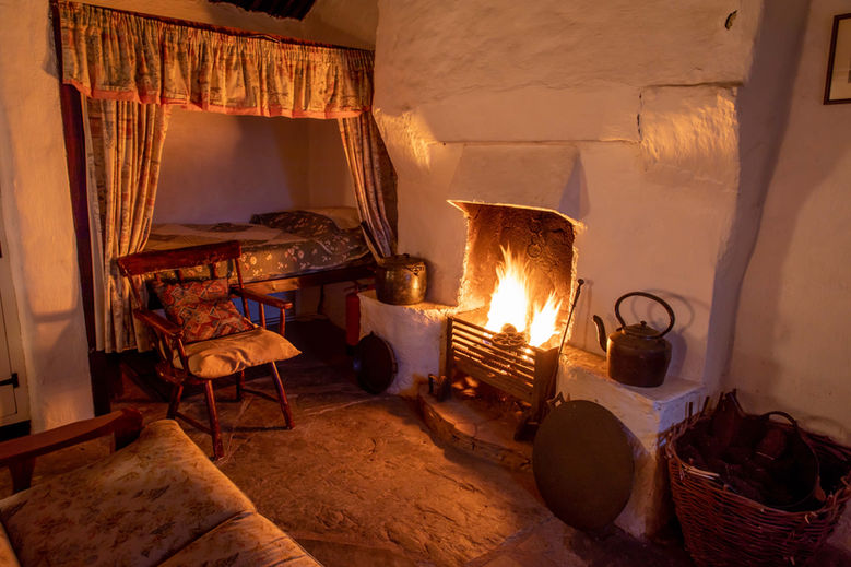 The bedroom has a large double, iron-railed poster bed with an additional ‘settle bed’ by the fireplace in the living area. This bed was a common feature in early Irish homes for those who needed the most warmth and comfort. It also has a curtain for privacy.